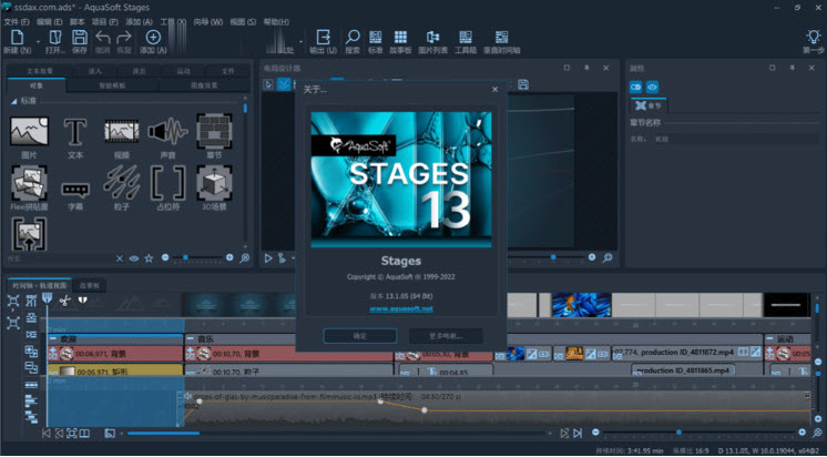Stages是由AquaSoft推出的一款專業的多媒體製作軟體,能夠將照片或者影片等檔進行編輯與建立,支援文字添加、線上媒體、圖片編輯等功能,包含多種效果範本,以及作品演示,並且還支援你在製作的時候,擁有很好的縮放效果,通過簡單的設置,既可以製作出您需要的效果,包含了作品的演示等;而且還可以進行生成您需要的HTML 版本、exe、zip等格式,並且軟體和相同類型的軟體進行相比較的話,功能要更加的全面,效果也要更加的好,運行更穩定等,支持無限數量的軌道,通過多軌道可以輕鬆的合併影片、照片、字幕和聲音,甚至可以為每個軌道添加各種特效,從而讓你的影片更加的專業!